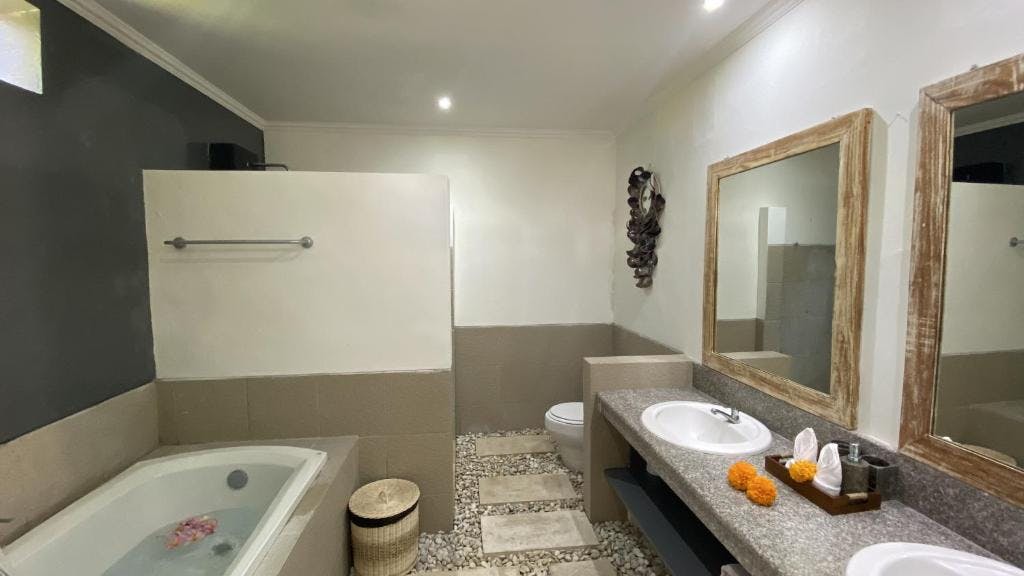 The air-conditioned double room has a seating area, a private bathroom with a bath and a shower, and air conditioning. In addition to a patio and balcony, the double room has a safe deposit box and a closet. There is only one bed in the apartment.